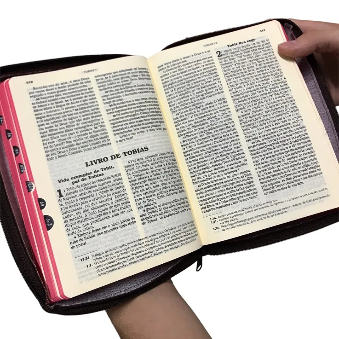 Esta edição tamanho bolso, com capa marrom estilo couro e fechamento em zíper, é perfeita para quem deseja praticidade, proteção e facilidade para levar a Palavra de Deus a qualquer lugar.