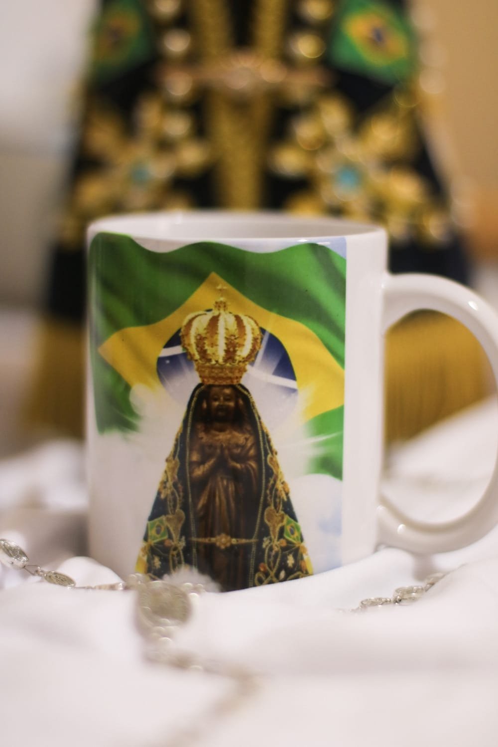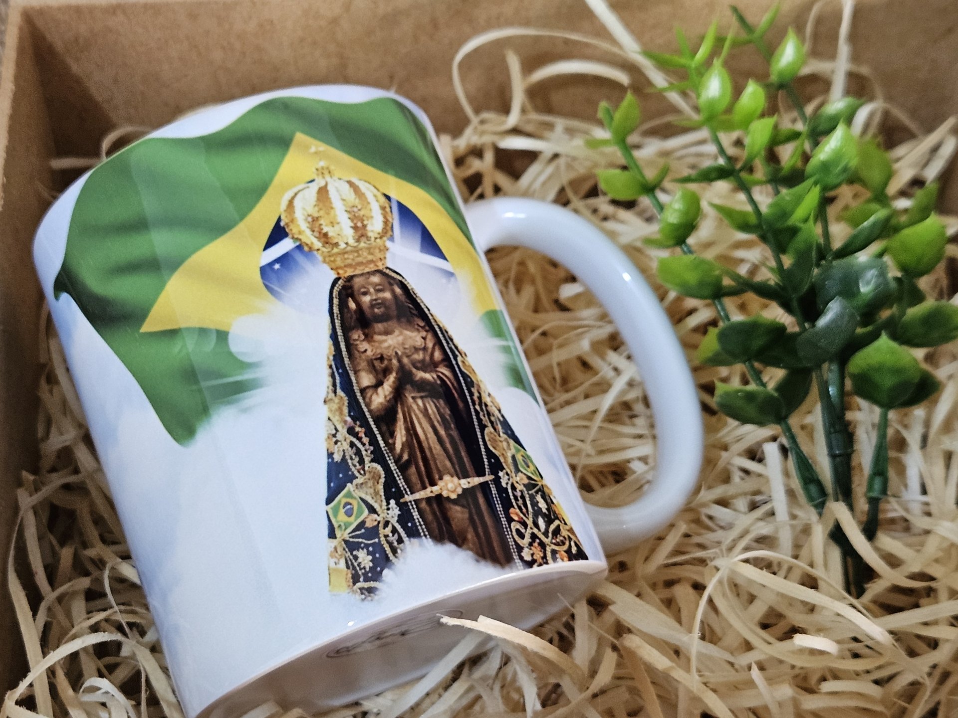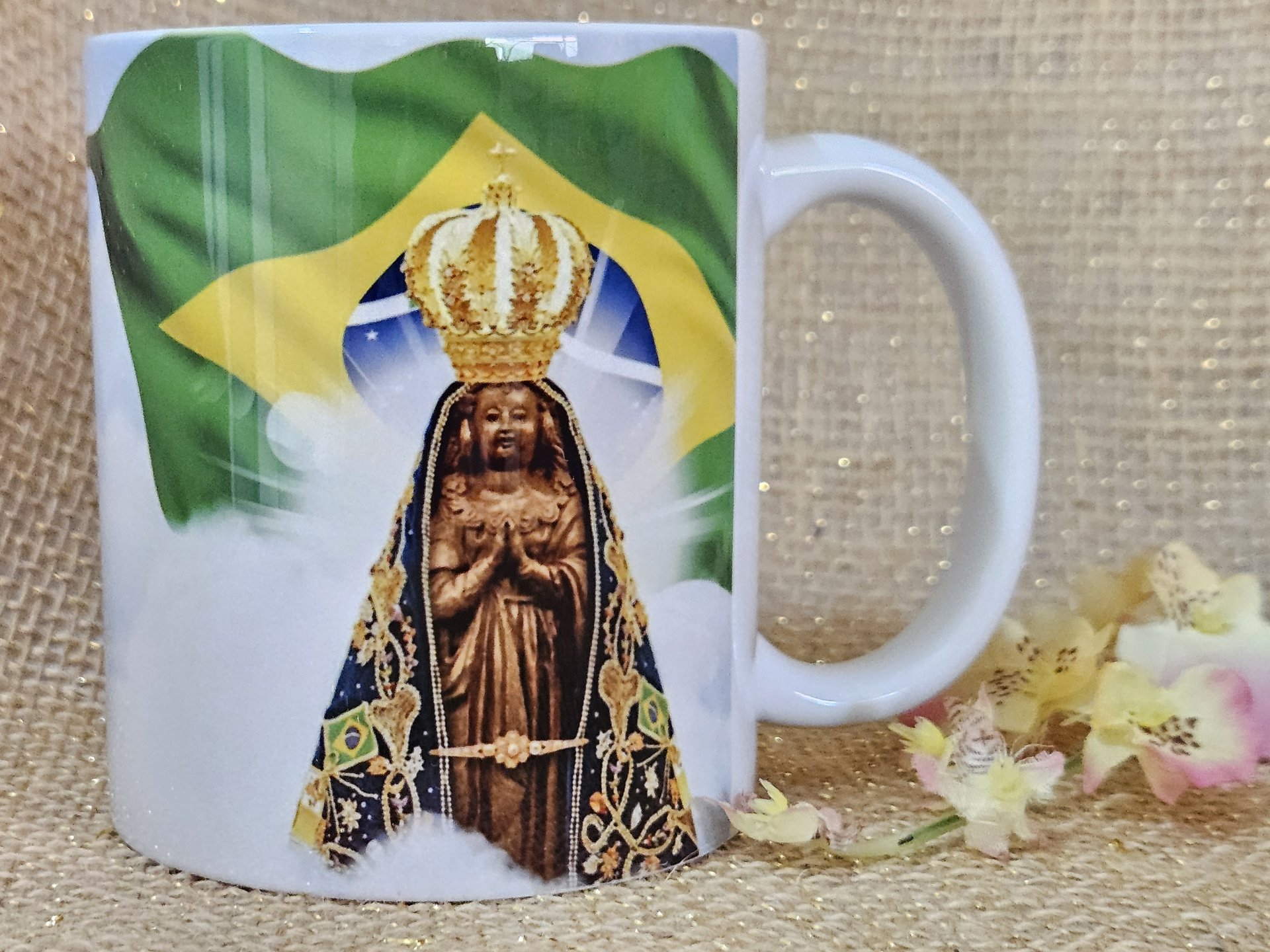 A Caneca Nossa Senhora Aparecida com Bandeira do Brasil é uma expressão de fé e amor à Padroeira do Brasil. Unindo o símbolo nacional à imagem da Mãe Aparecida, ela representa a proteção da Virgem sobre nossa nação e sobre todos os seus devotos.