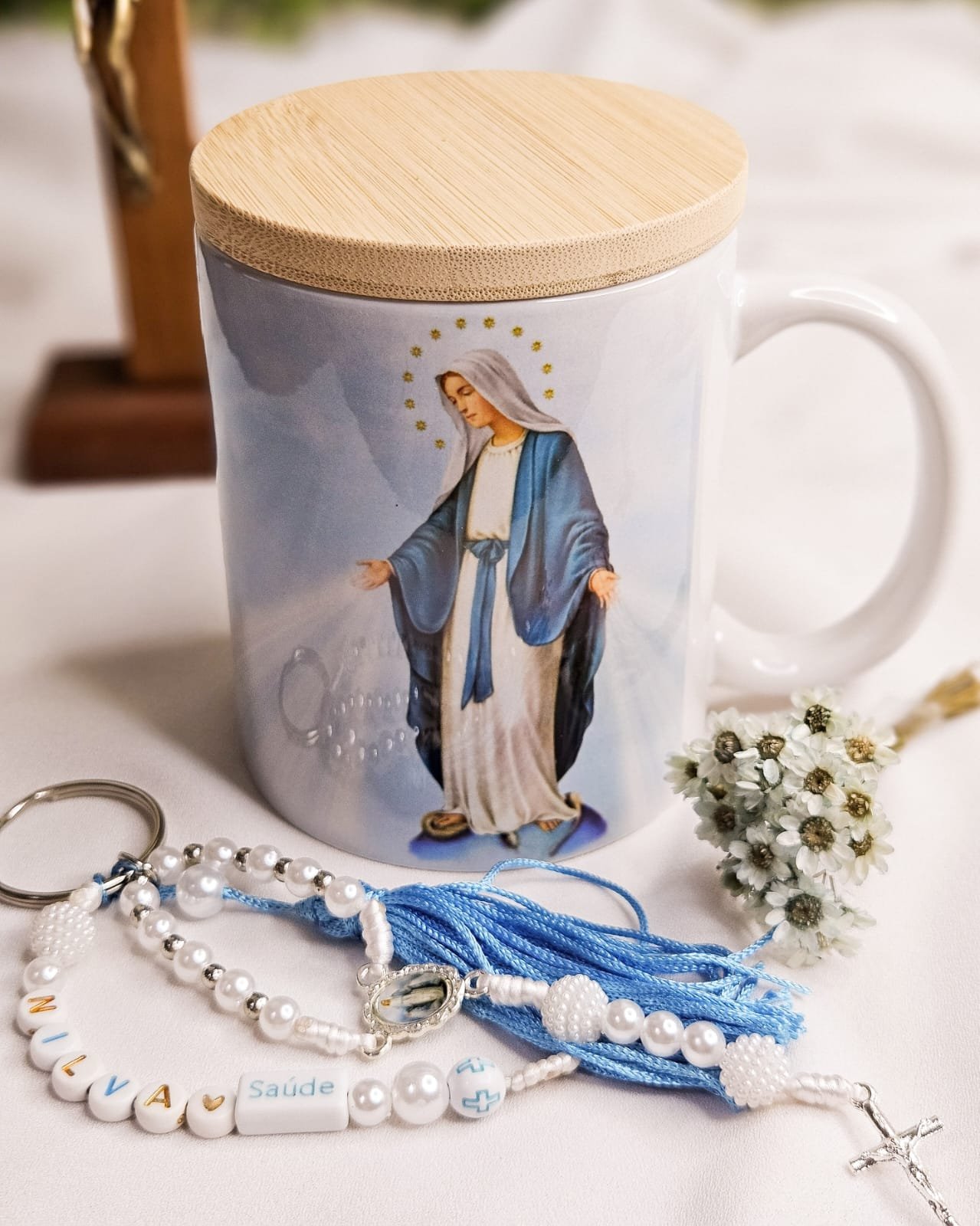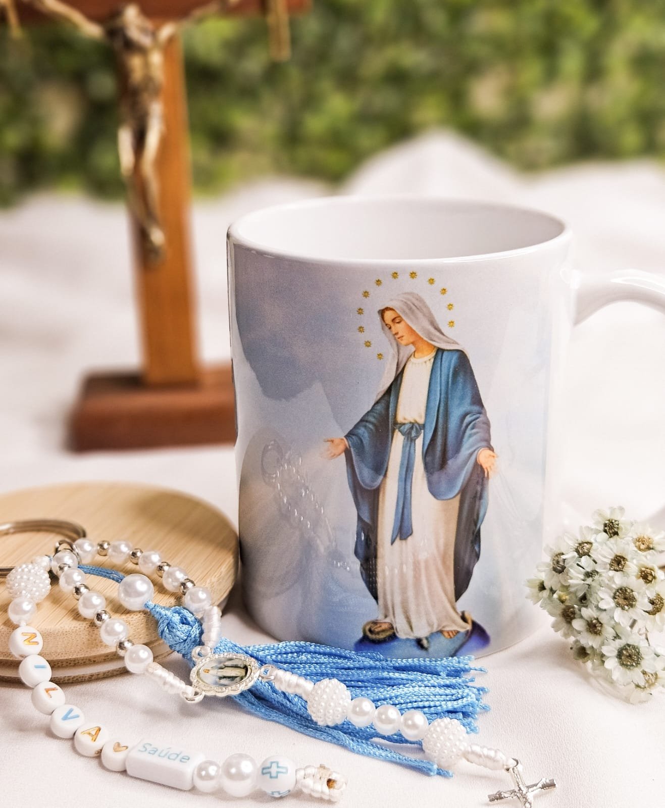 Esta linda caneca da Medalha Milagrosa representa a devoção a Nossa Senhora das Graças, símbolo de proteção e intercessão divina. A imagem de Maria estende suas mãos sobre o mundo, derramando as bênçãos prometidas a quem recorre ao seu amor maternal. Um objeto que une beleza, fé e propósito, ideal para fortalecer sua espiritualidade no dia a dia.