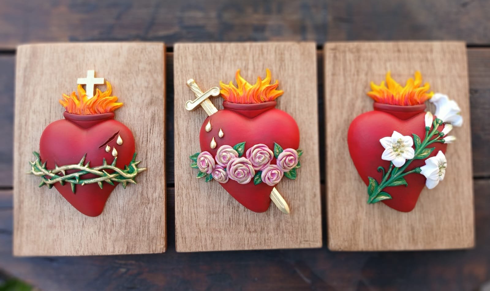 Produto: Conjunto de 3 Quadros Corações Sagrados em Gesso e Madeira