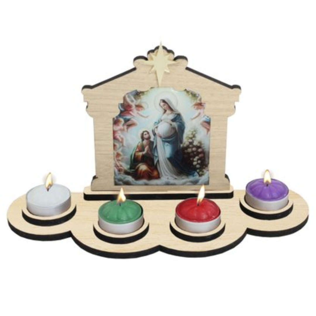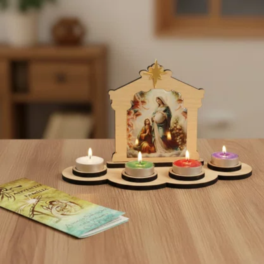 Celebre o tempo do Advento com esta linda Coroa do Advento em MDF, produzida com acabamento delicado e ideal para momentos de oração e preparação para o Natal. O conjunto inclui um oratório em MDF e quatro velas rechô, cada uma representando um domingo do Advento.