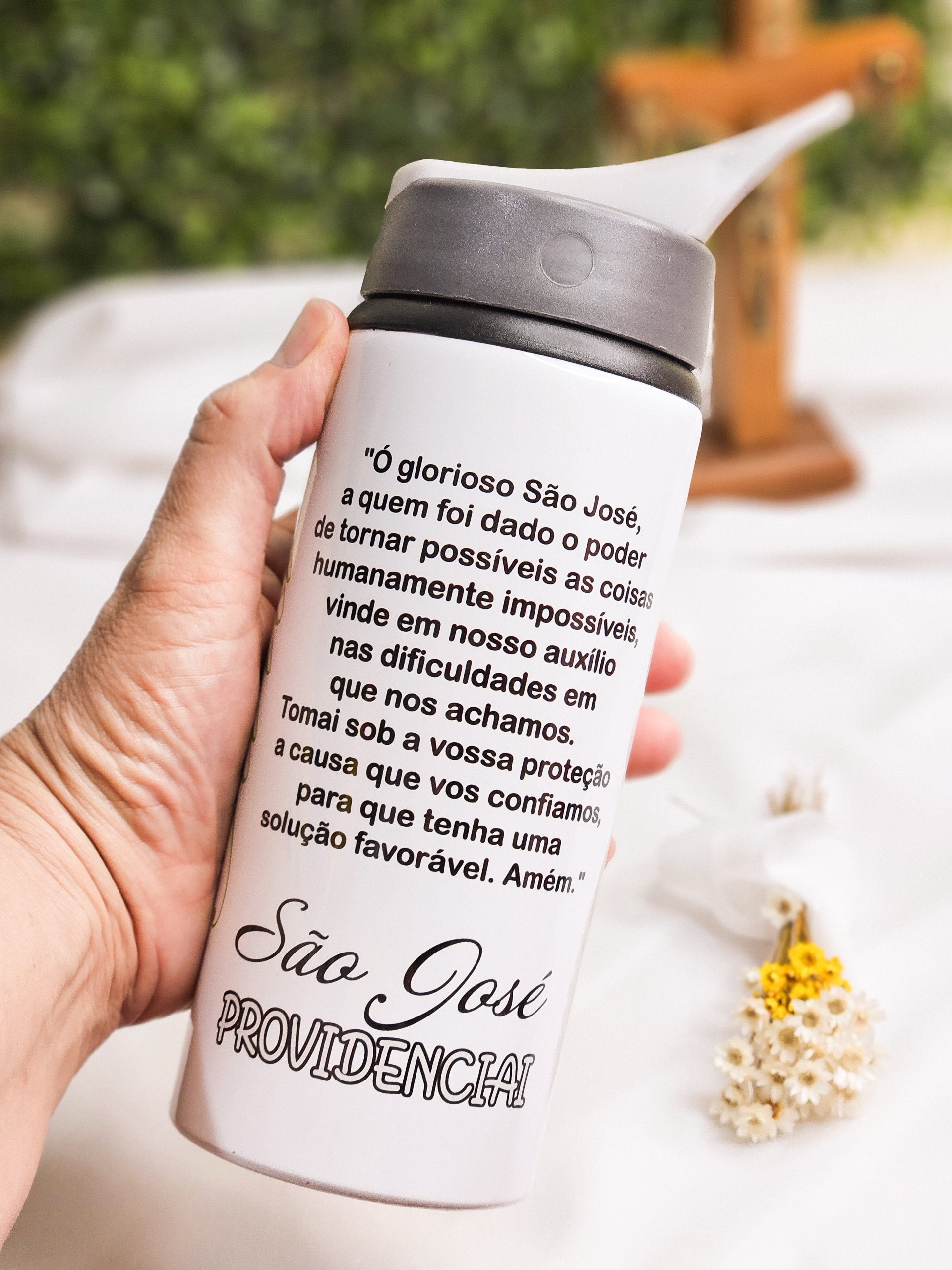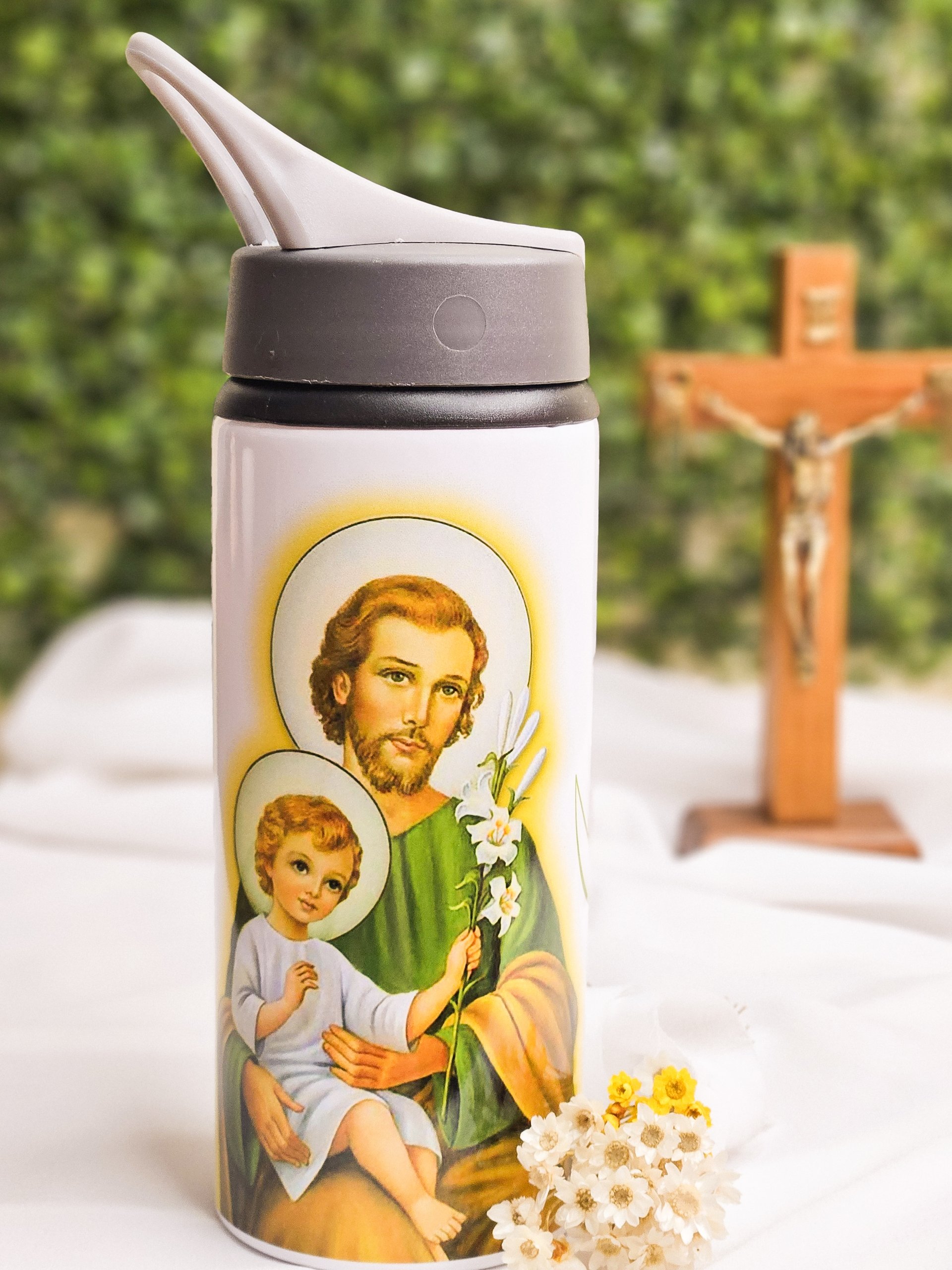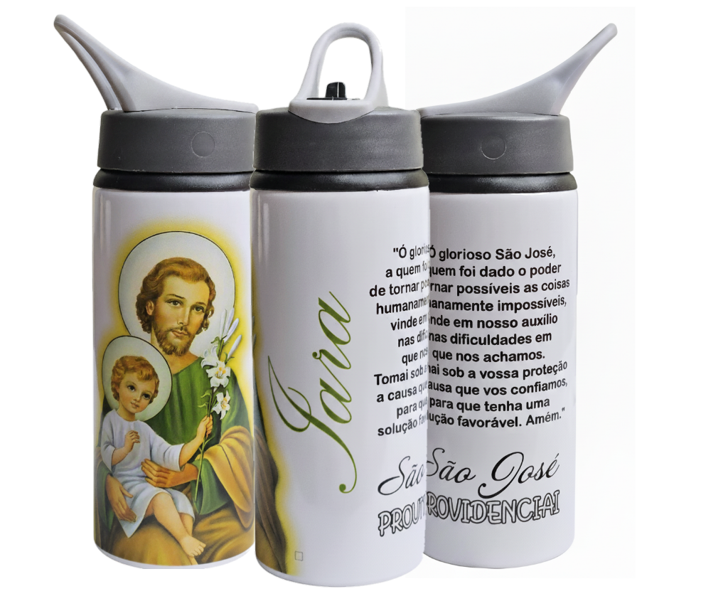 A Garrafinha Térmica Personalizada de São José é um item devocional para levar a fé ao cotidiano. Estampa a imagem de São José com o Menino Jesus — símbolo de proteção, providência e cuidado paternal.