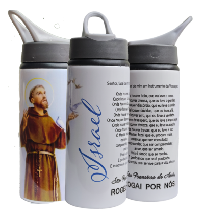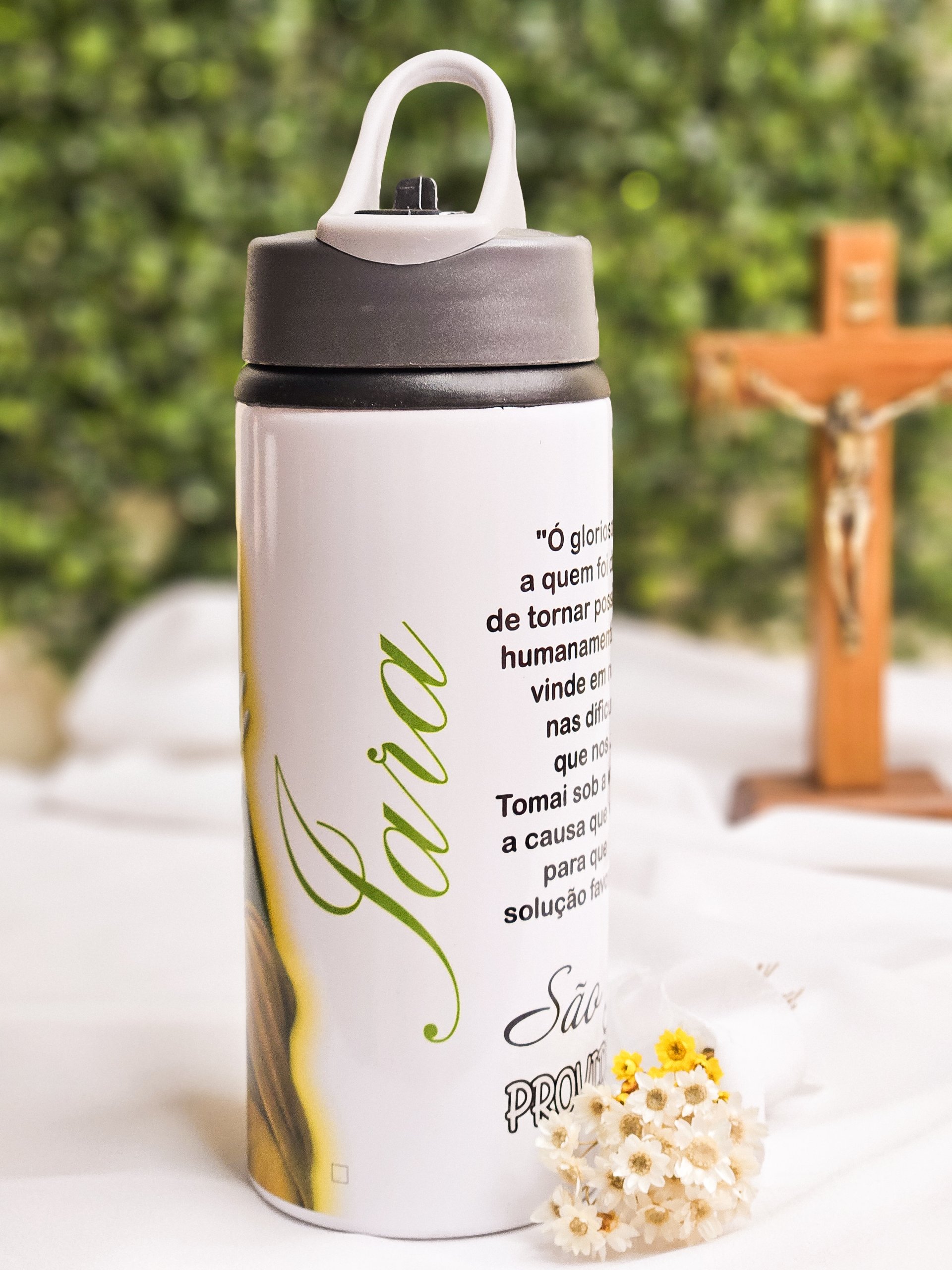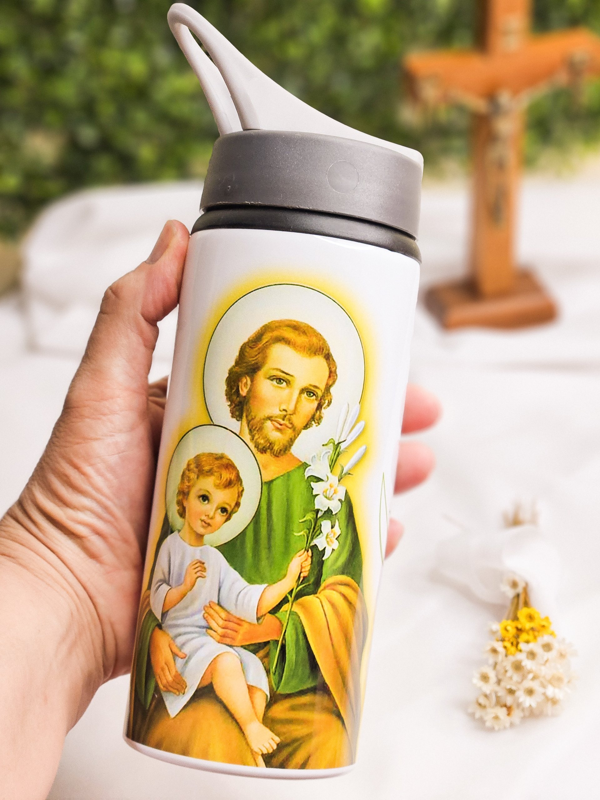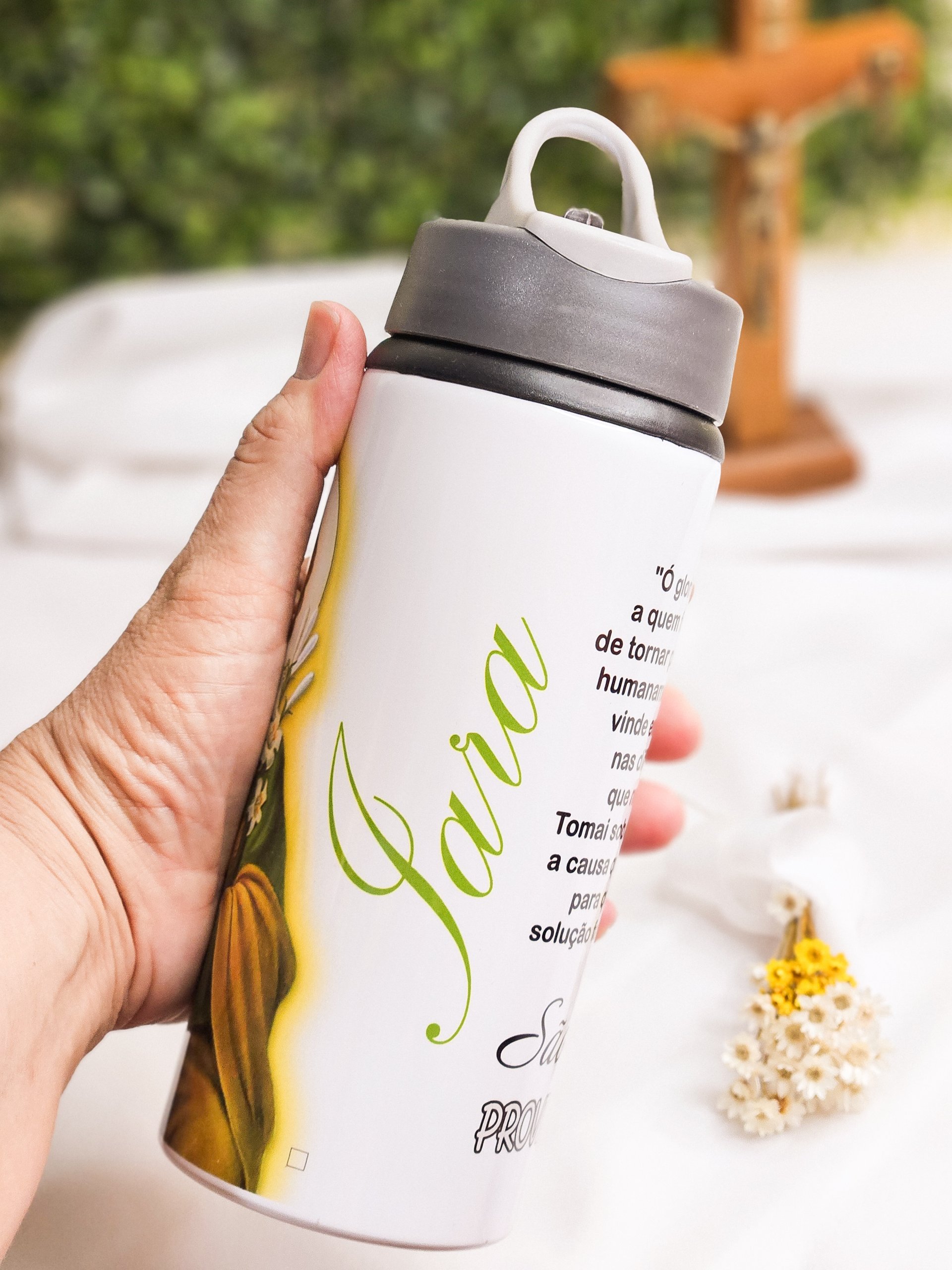 A Garrafinha Térmica Personalizada de São José é um item devocional para levar a fé ao cotidiano. Estampa a imagem de São José com o Menino Jesus — símbolo de proteção, providência e cuidado paternal.