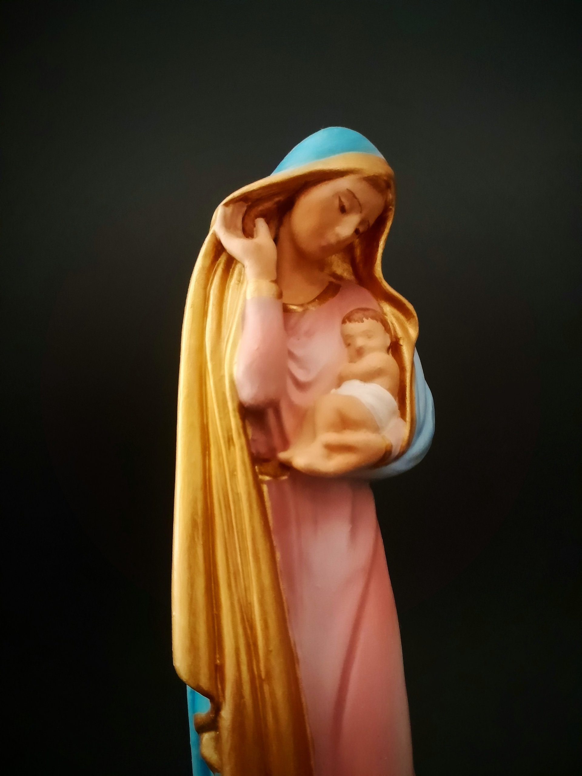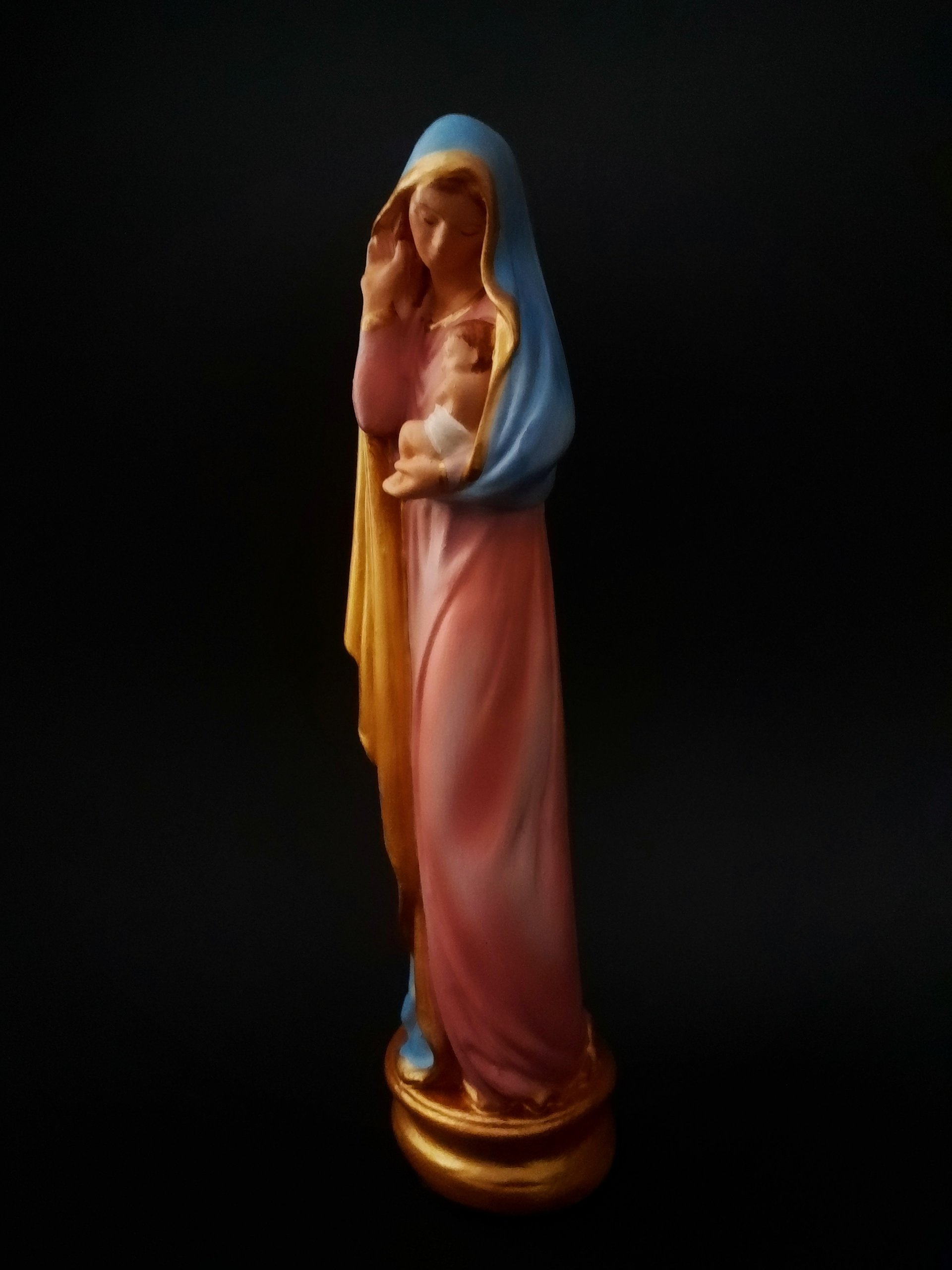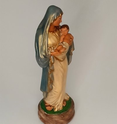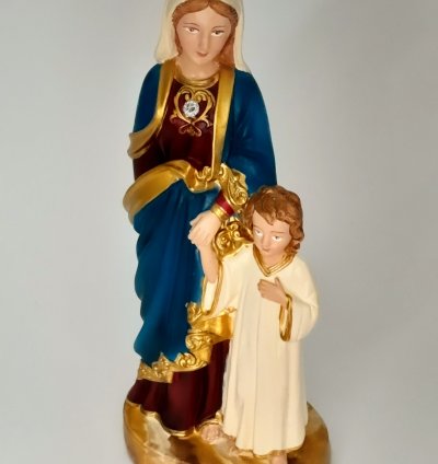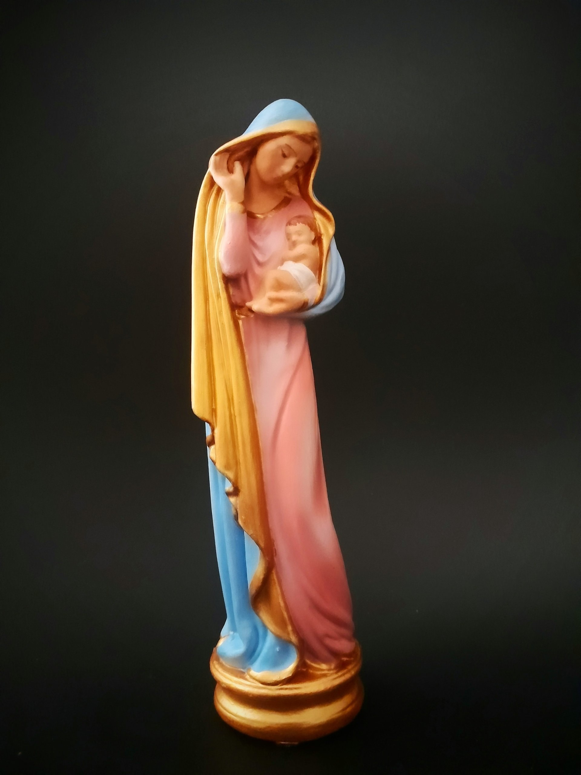 Representada com ternura, esta imagem retrata Nossa Senhora acolhendo com amor o Filho em seus braços. Mais do que uma escultura, transmite o simbolismo do aconchego materno, da proteção e confiança que encontramos no colo Maria. É um convite à oração, à entrega, lembrando que o cuidado da Mãe de Deus se estende a todos os seus filhos. Oferecendo paz, entrega e esperança.