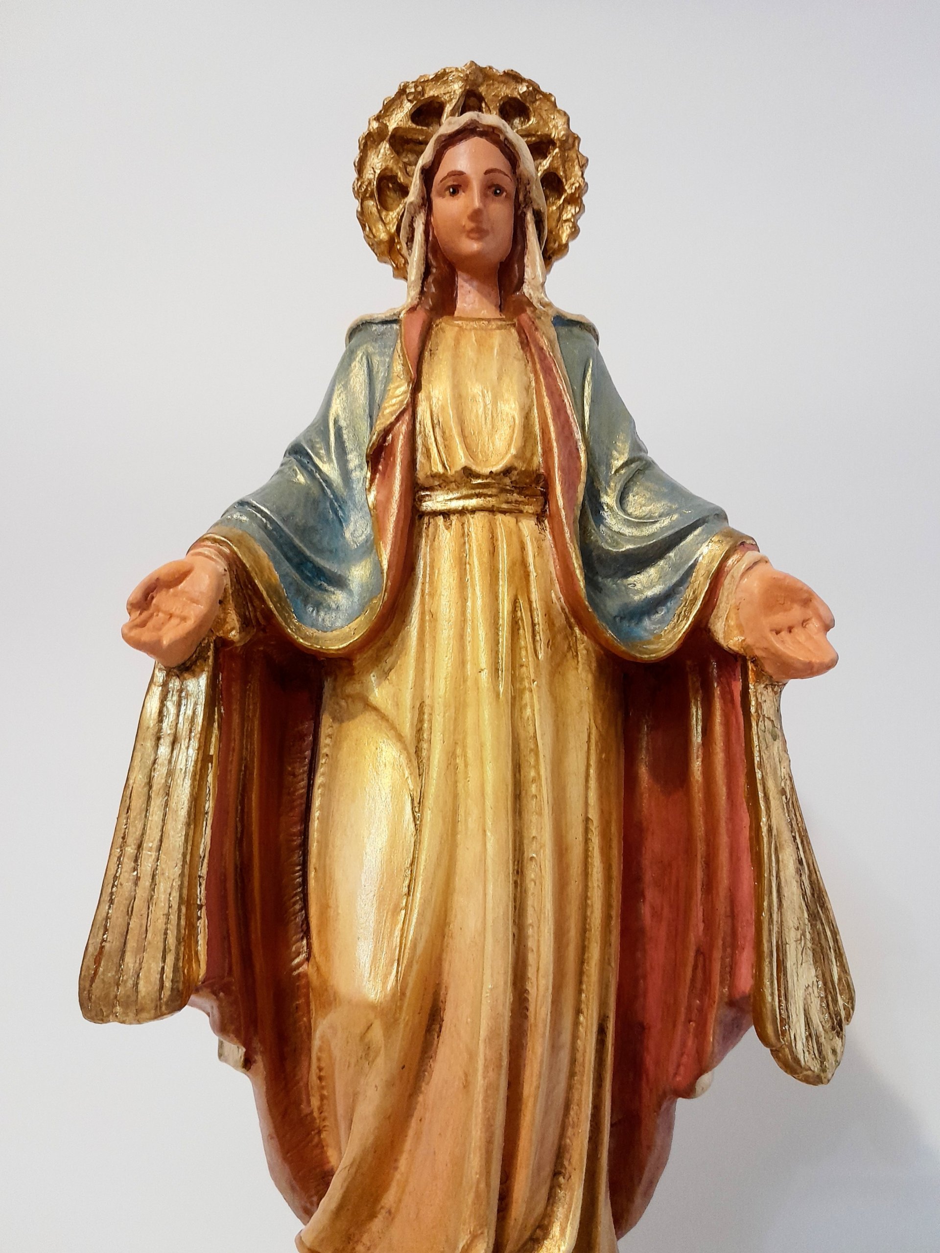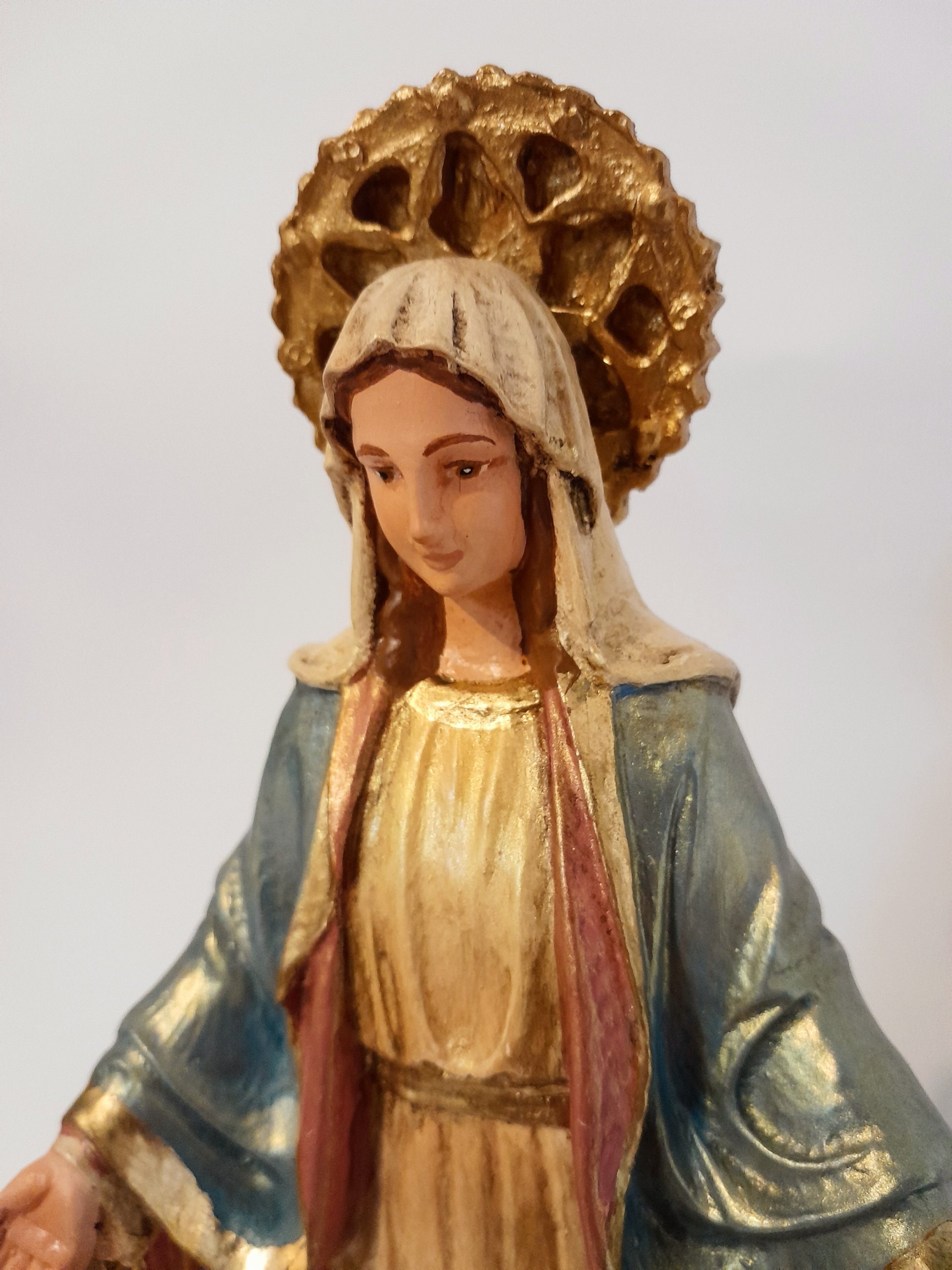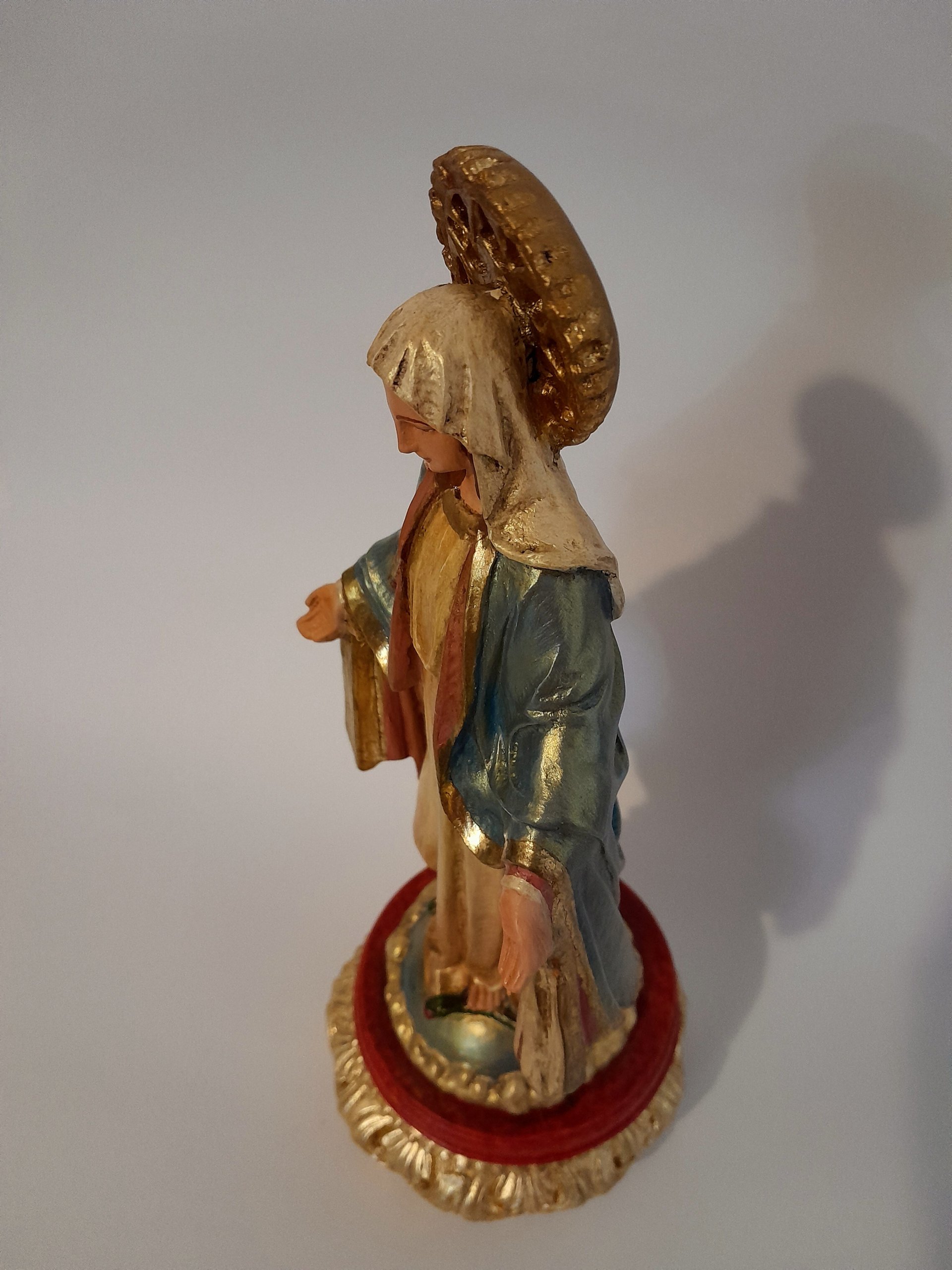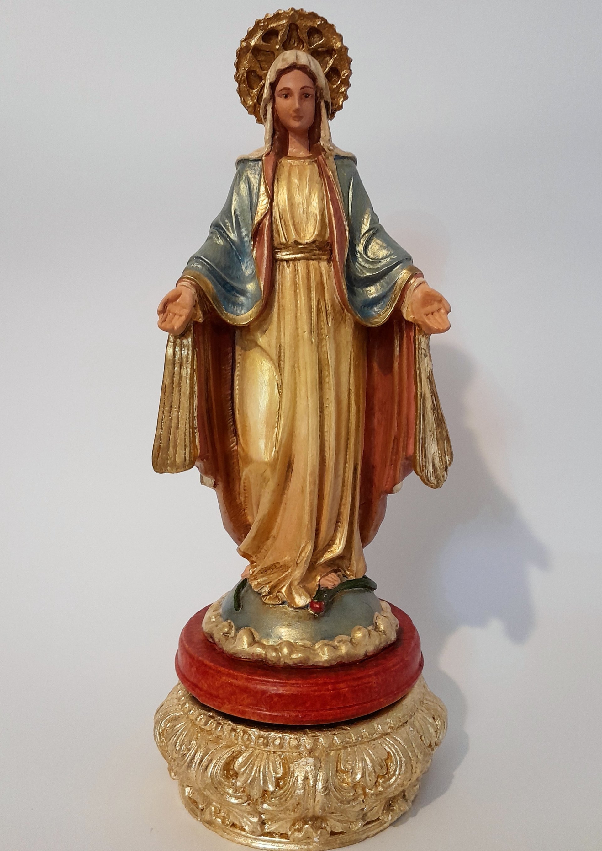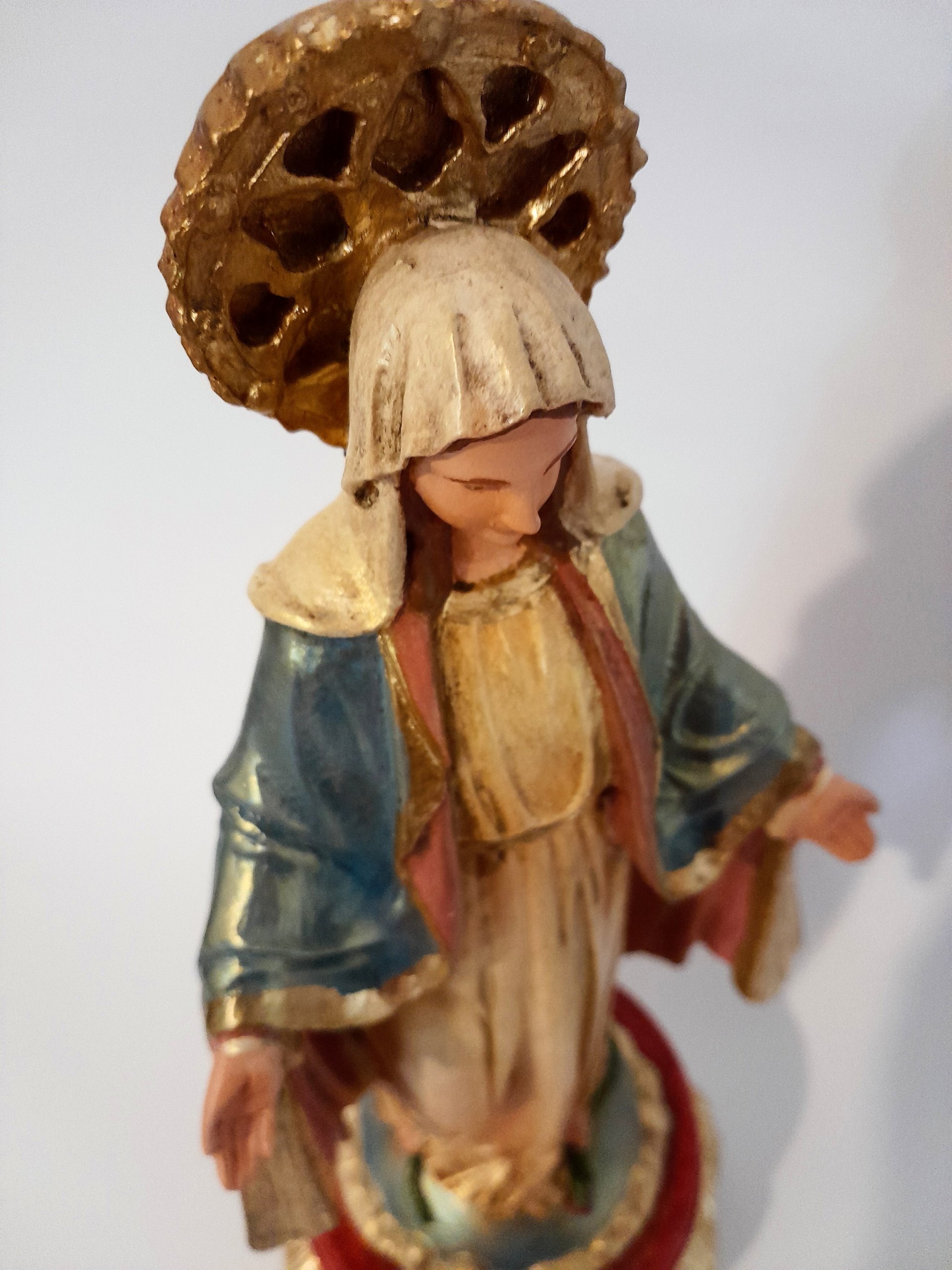 Imagem de Nossa Senhora das Graças com aproximadamente 30 cm, confeccionada em gesso e pintada à mão com delicada policromia em tom envelhecido, que realça a serenidade do seu semblante.