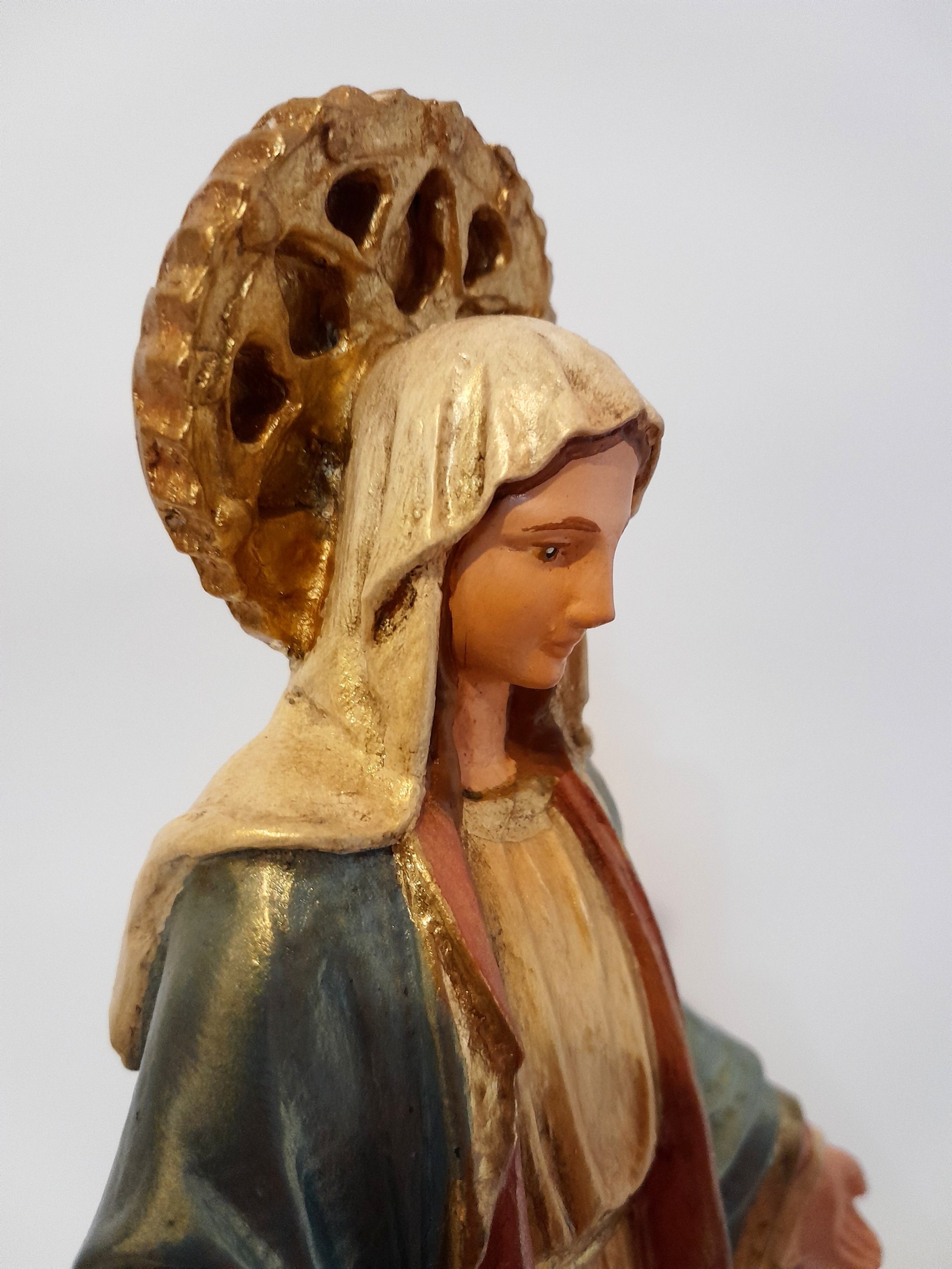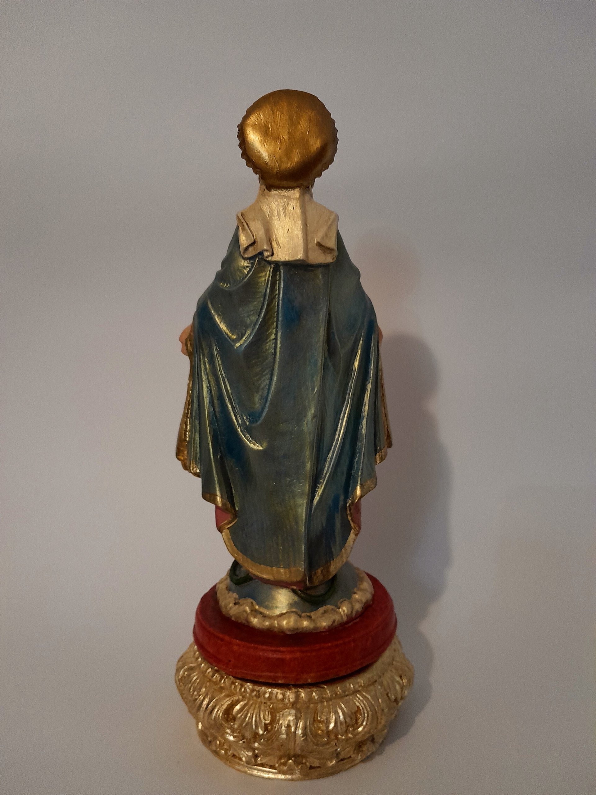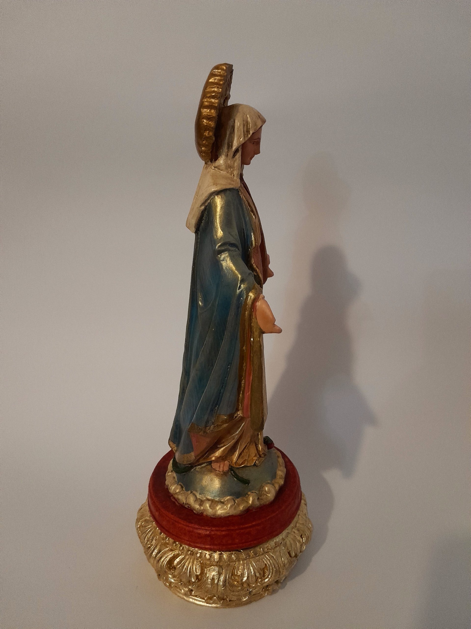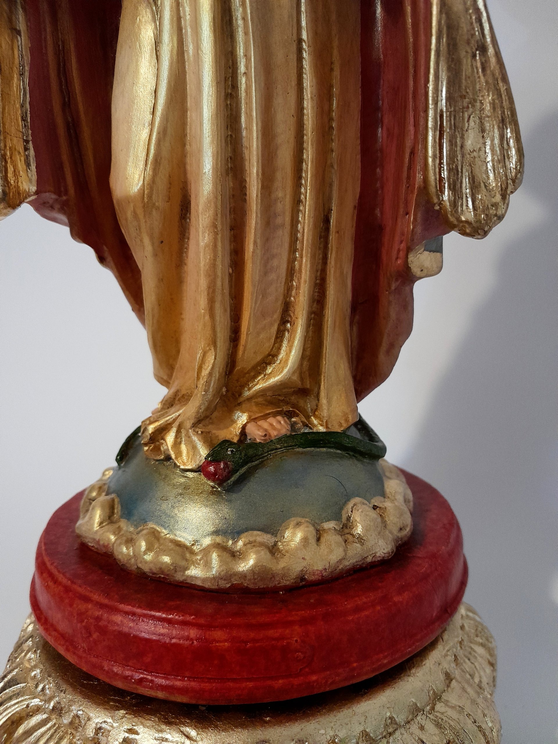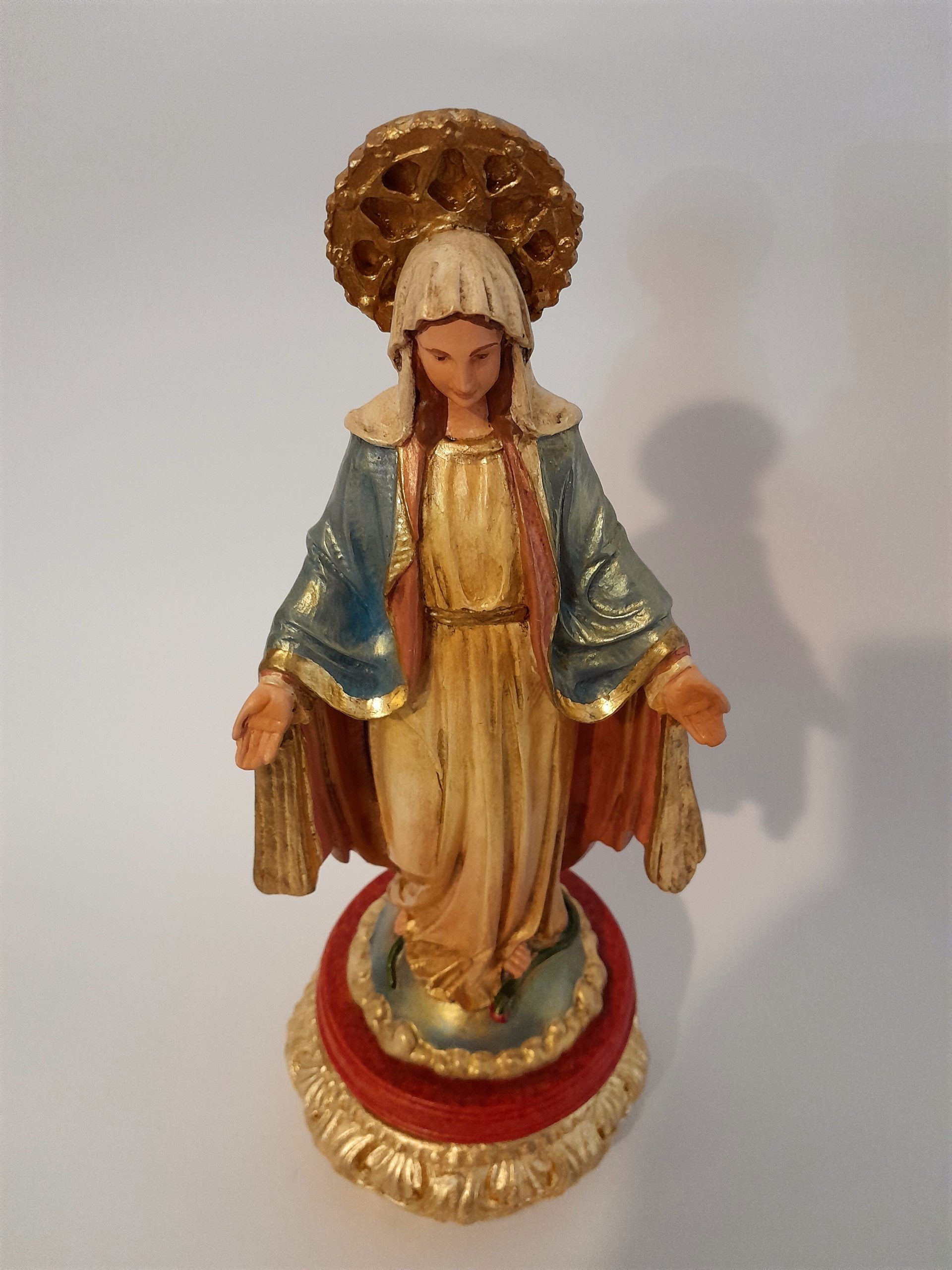 Imagem de Nossa Senhora das Graças com aproximadamente 30 cm, confeccionada em gesso e pintada à mão com delicada policromia em tom envelhecido, que realça a serenidade do seu semblante.