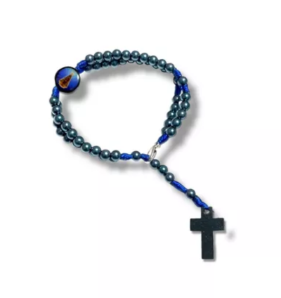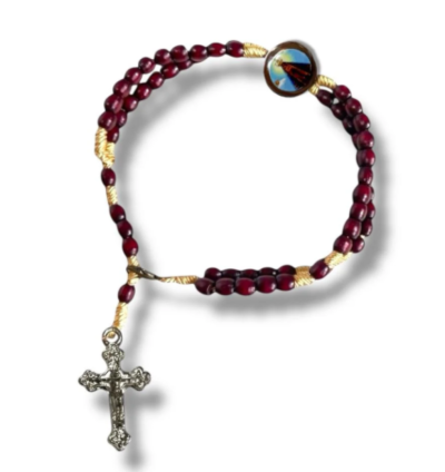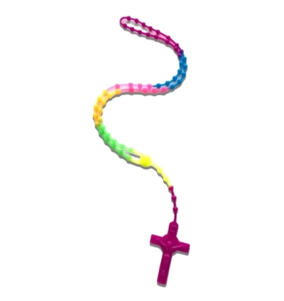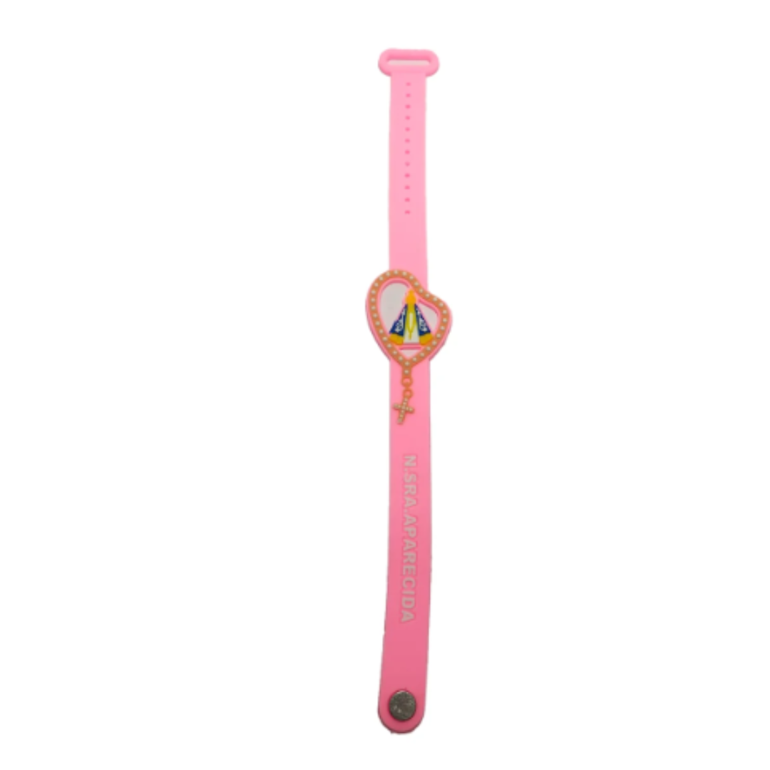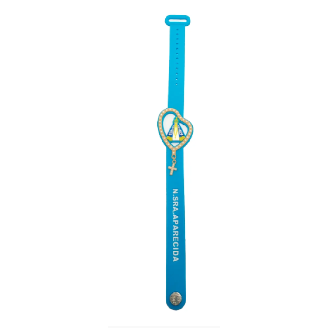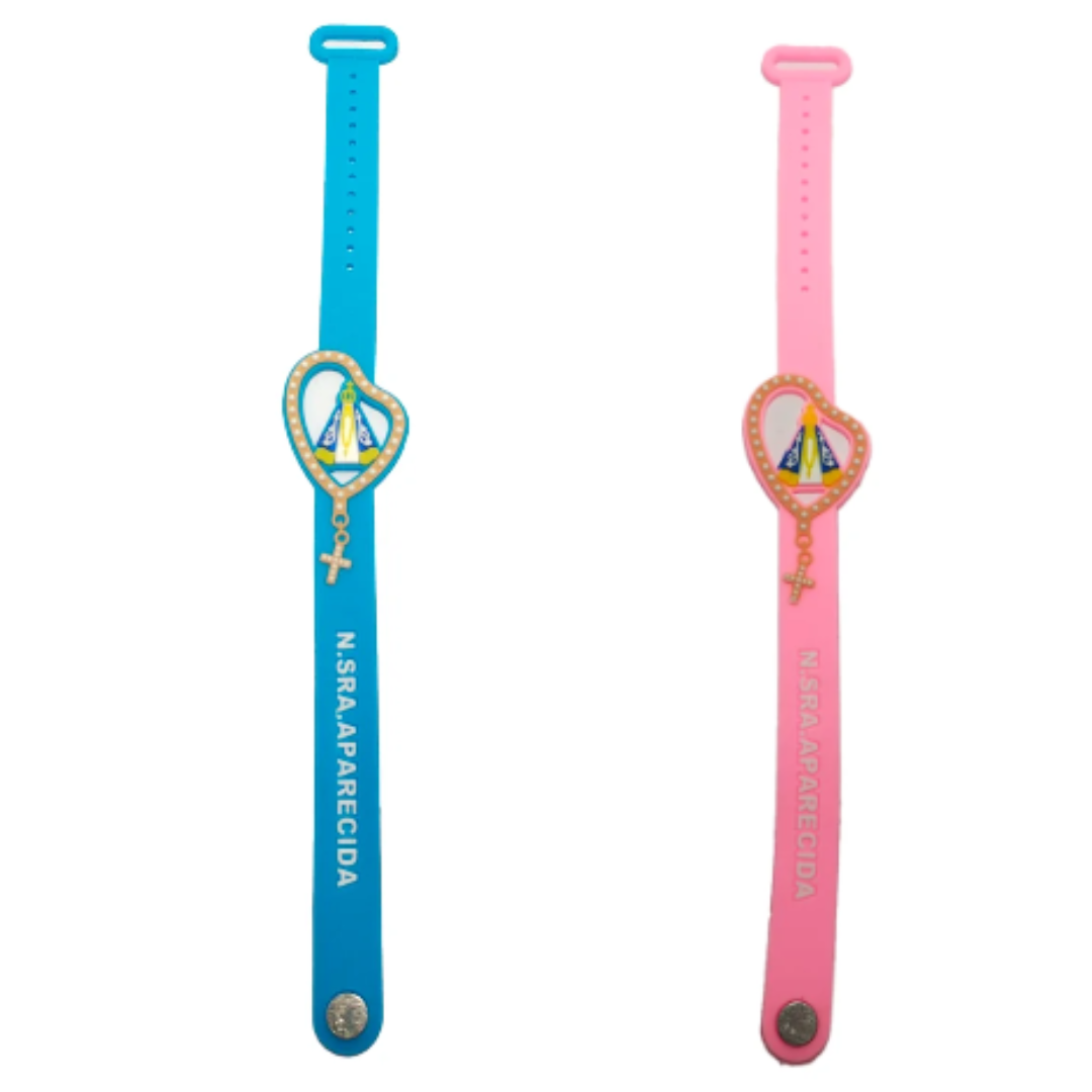 Produzida em silicone macio e resistente, possui medalhinha em alto-relevo no formato de terço com a imagem de Nossa Senhora Aparecida e um pequeno pingente de cruz, tornando o acessório ainda mais especial.
