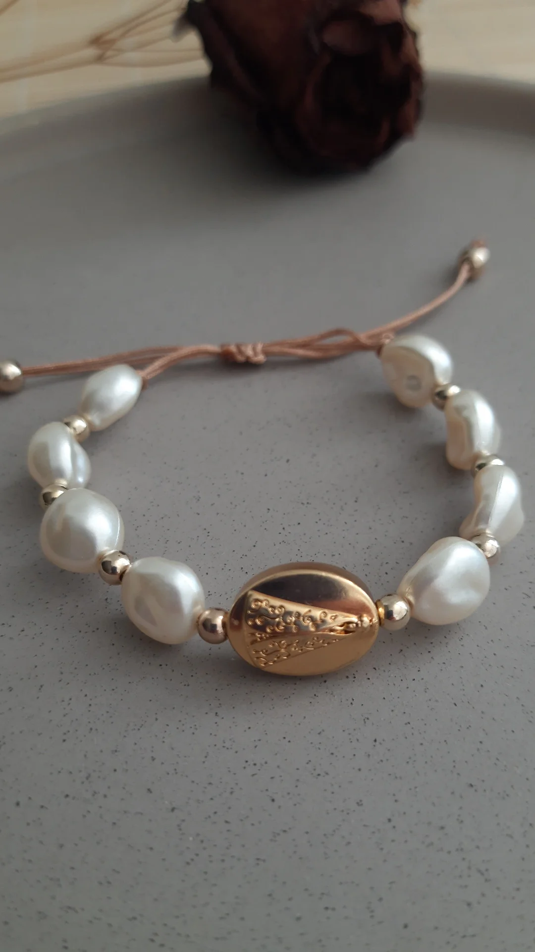 Pulseira com pérolas barrocas e medalha dourada de Nossa Senhora Aparecida.