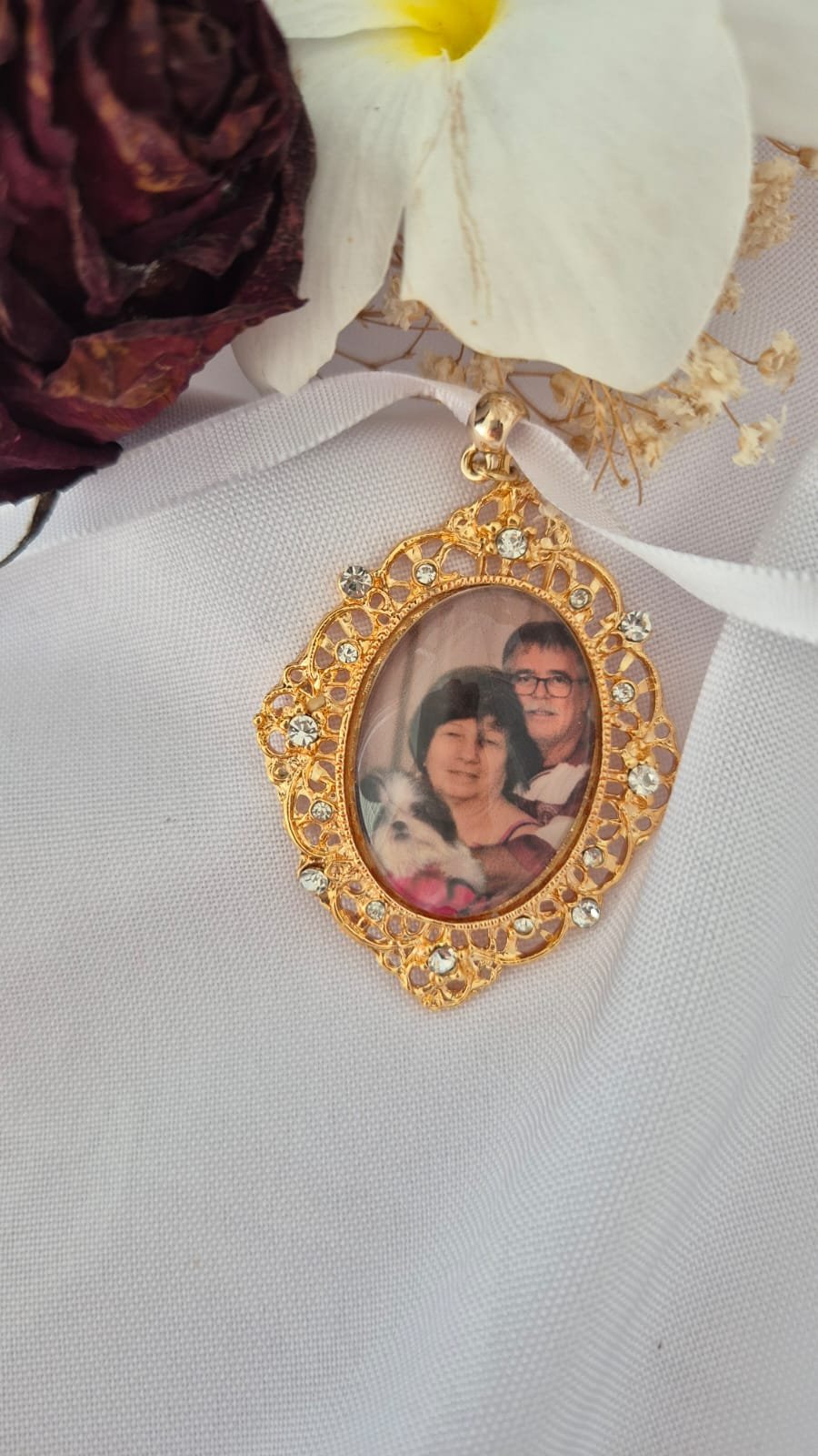 Relicário com banho de alta qualidade, strass , foto impressa em papel especial e com um visor de vidro que dá um toque mais do que especial a peça.