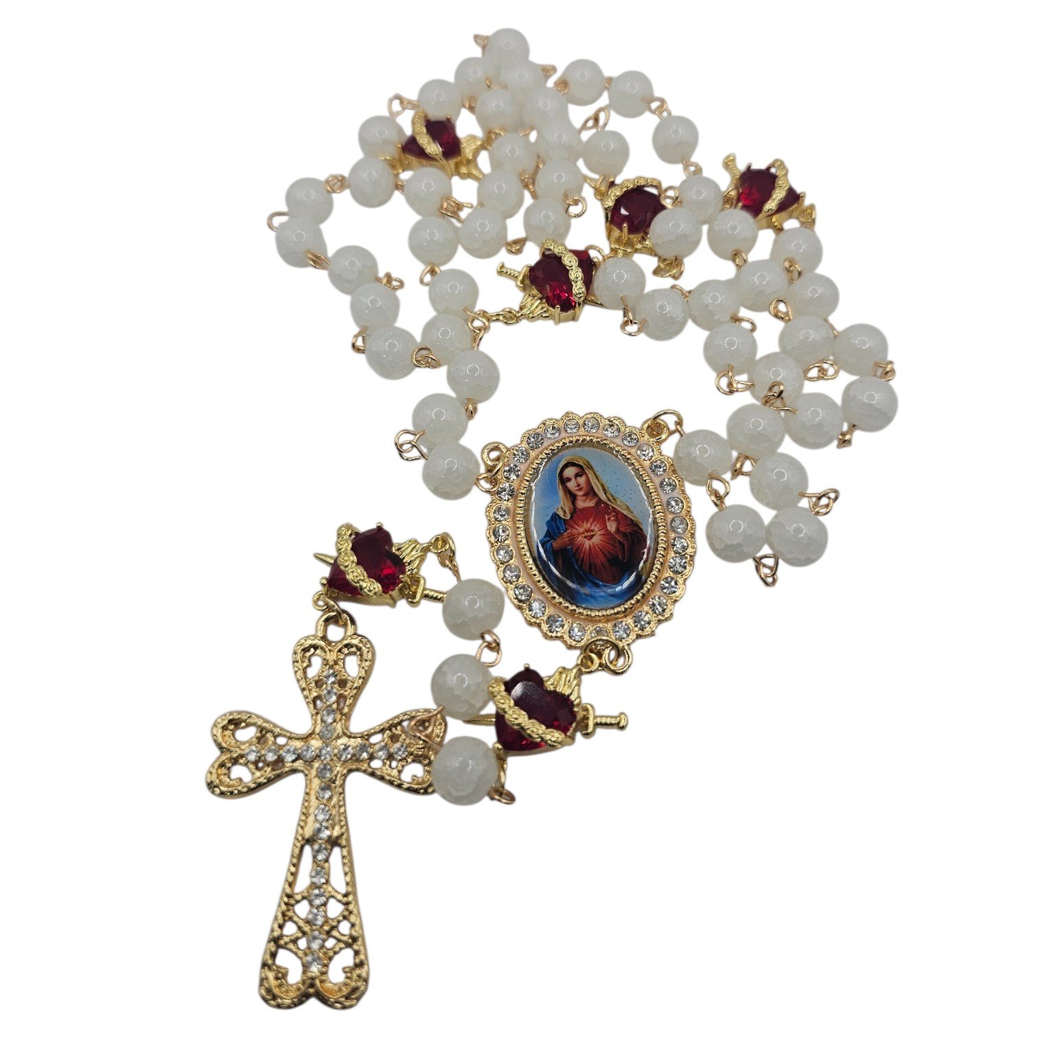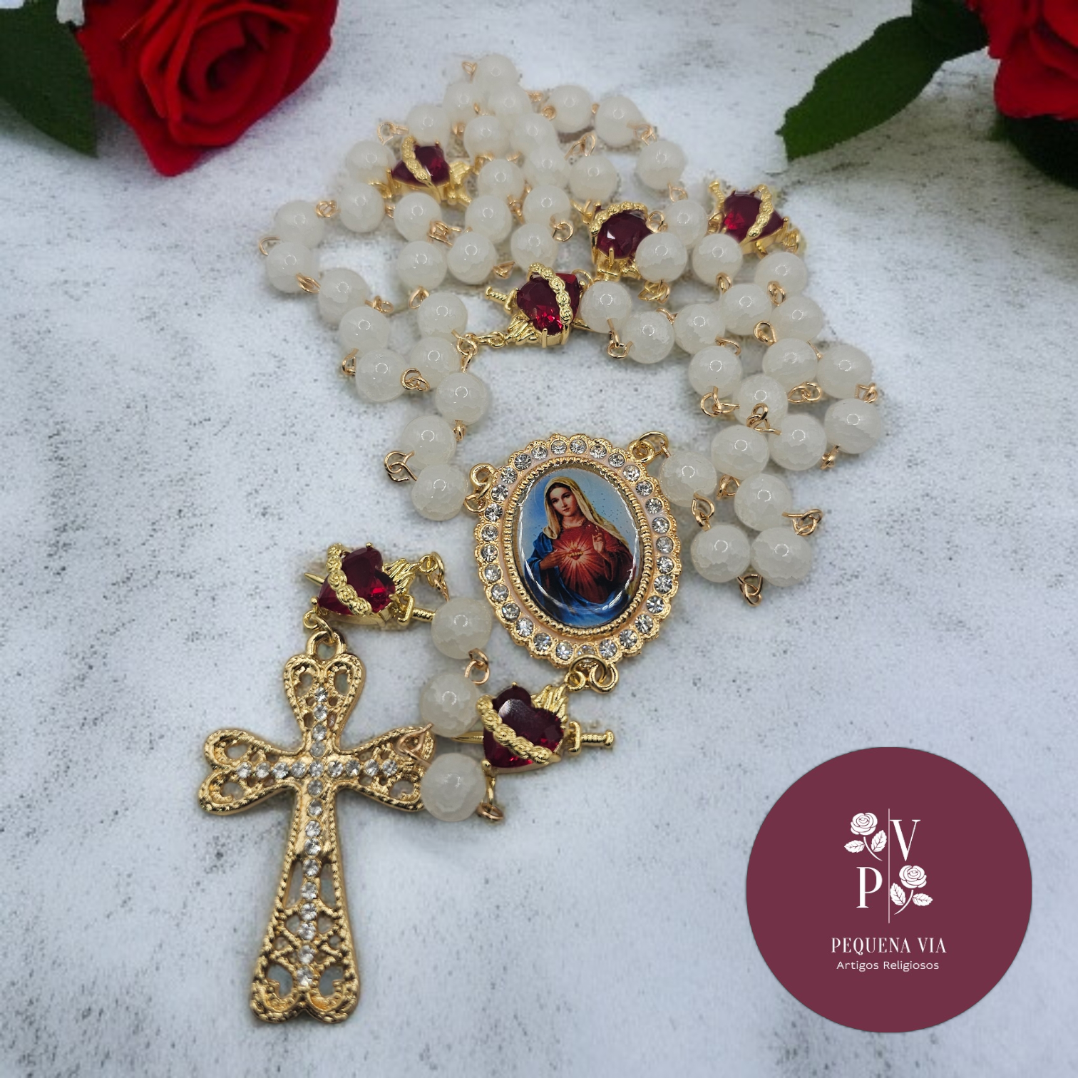 Este terço dedicado em honra o Imaculado Coração de Maria, sinal de amor materno, pureza e consolo. Suas contas claras evocam a luz que brota do coração da Mãe, enquanto os detalhes dourados e rubros lembram o amor ardente que intercede por cada filho. Um terço para quem deseja caminhar sob o manto da Virgem, buscando paz, proteção e íntima união com Jesus por meio do seu Coração Imaculado.