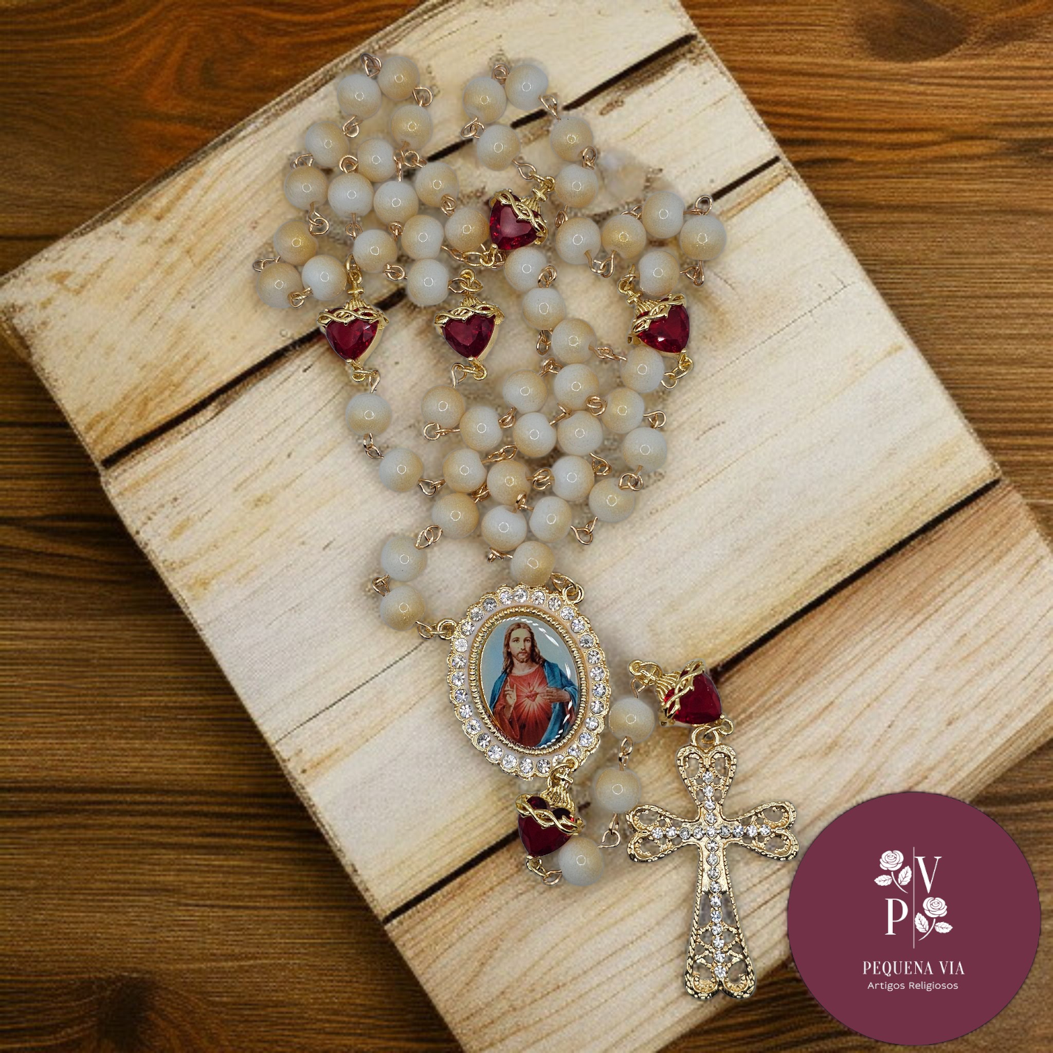 Terço inspirado na ternura e misericórdia do Sagrado Coração. Suas contas peroladas e detalhes dourados realçam o medalhão de Jesus, cuja chama de amor convida à confiança e reparação. Os delicados corações vermelhos lembram o amor ardente de Cristo pela humanidade. Um terço que conduz à paz, à entrega e à verdadeira devoção ao Coração de Jesus. Ideal para oração diária e para presentear.